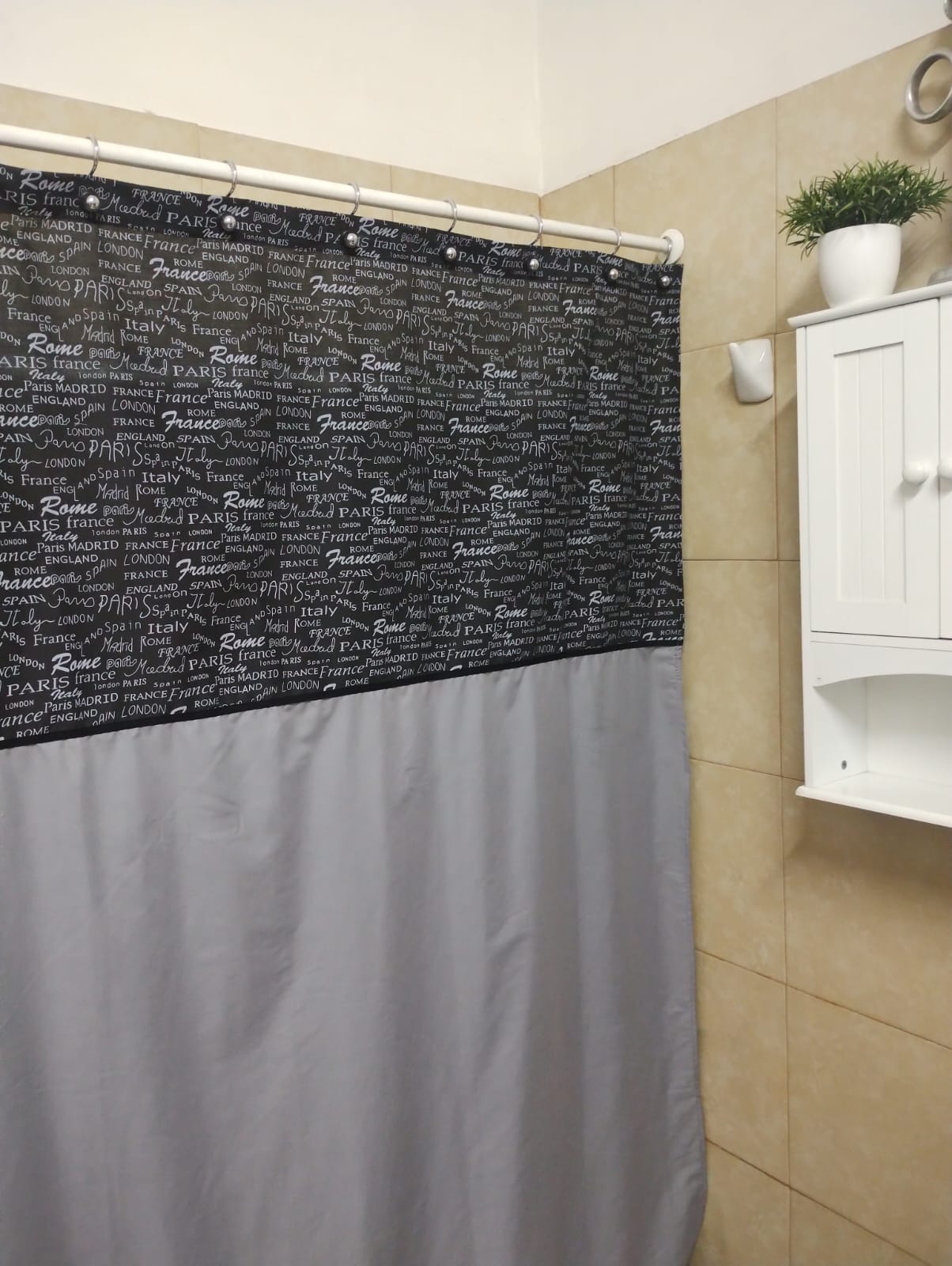 Cortina de Baño Gris Letra Negra con sesgo 200×200 cms SKU 0270